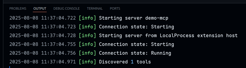 To start the server, hit Crtl+Shift+P again and choose MCP: List Servers. Select the demo-mcp server you just created. and Start Server.